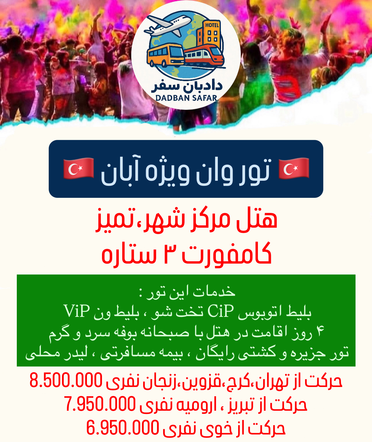 خدمات این تور جذاب : بلیط رفت و برگشت اتوبوس وی ای پی ، بلیط رفت و برگشت ون توریستی ، ۳ شب و ۴ روز اقامت در هتل ۳ ستاره کامفورت ، صبحانه بوفه ، بیمه مسافرتی ۱۰/۰۰۰ یورویی ، گشت جزیره و کشتی رایگان شامل : بازدید از خانه وارونه-خانه گربه ها-قلعه وان-ساحل-ادرمیت-پل شیشه ایی-کشتی سواری در دریاچه وان با دی جی ☎️021-91096751📱09938244709📱09938248207