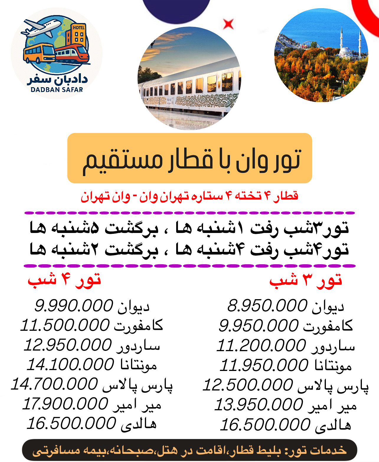 تور وان ترکیه ویژه پاییز ۱۴۰۴ با قطار مستقیم تهران وان - وان تهران با خدمات : بلیط رفت و برگشت قطار مستقیم ۴ تخته ۴ ستاره سریر ، اقامت در هتل ، صبحانه بوفه ، بیمه مسافرتی ، لیدر محلی،تورهای تفریحی اپشنال و گردشگری اختیاری تور قطار ۳ شب اقامت : رفت هر ۱ شنبه ساعت ۱۳ از راه آهن تهران زمان رسیدن به راه آهن وان ۱۱:۰۰برگشت هر ۵ شنبه ساعت ۲۱ از راه آهن وان زمان رسیدن به راه آهن تهران ۱۸:۳۰ تور قطار ۴ شب اقامت : رفت هر ۴ شنبه ساعت ۱۳ از راه آهن تهران زمان رسیدن به راه آهن وان ۱۱:۰۰برگشت هر ۲ شنبه ساعت ۲۱ از راه آهن وان زمان رسیدن به راه آهن تهران ۱۸:۳۰
